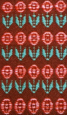 CHAYA NESSA'S BLOUSE & SKIRT TRIM FABRIC: The weave for this blouse is an 8 harness reverse twill. I used 2/17 wool doubled for the warp and for the alternate tabby (plain weave) and 5/2 pearl cotton doubled for the flower design. This flower was my own design.