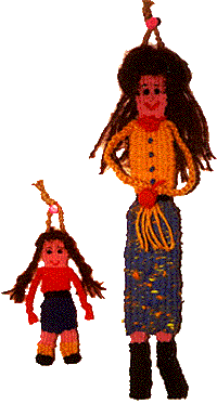 DEVI AND HER DOLL CALLED AUNTIE SHULA: Devi started with a blank sheet of paper and drew the doll's body onto freezer paper. I ironed the freezer paper onto the fabric that she chose. She then sewed around the freezer paper. After the fabric was cut out and turned right side out she stuffed her doll and painted its face. Trimming was added at the end. Devi won a blue ribbon for this doll at the 2003 West End Fair. Devi is six years old.