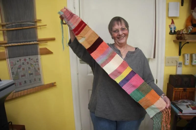 Bobbye Sansing took my "Introduction to Weaving" workshop. It was a 12 hour class given in four- 3 hour sessions. She took it December 3,4,18 and 24, 2014 and learned how to wind a warp on my warping board, thread her loom, weave various patterns on her loom and learned how to weave a weaving draft. She did a wonderful job.