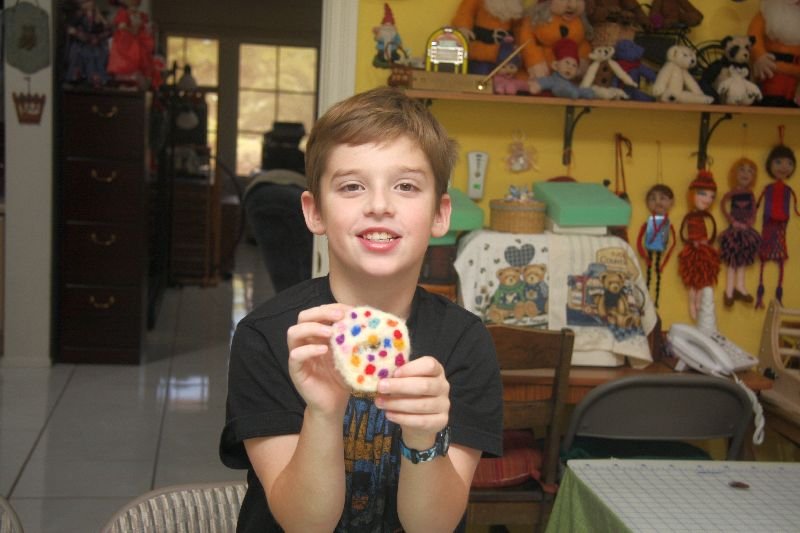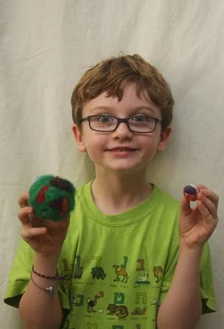 Eli holding up his fantastic teddy bear and needle felted ball.